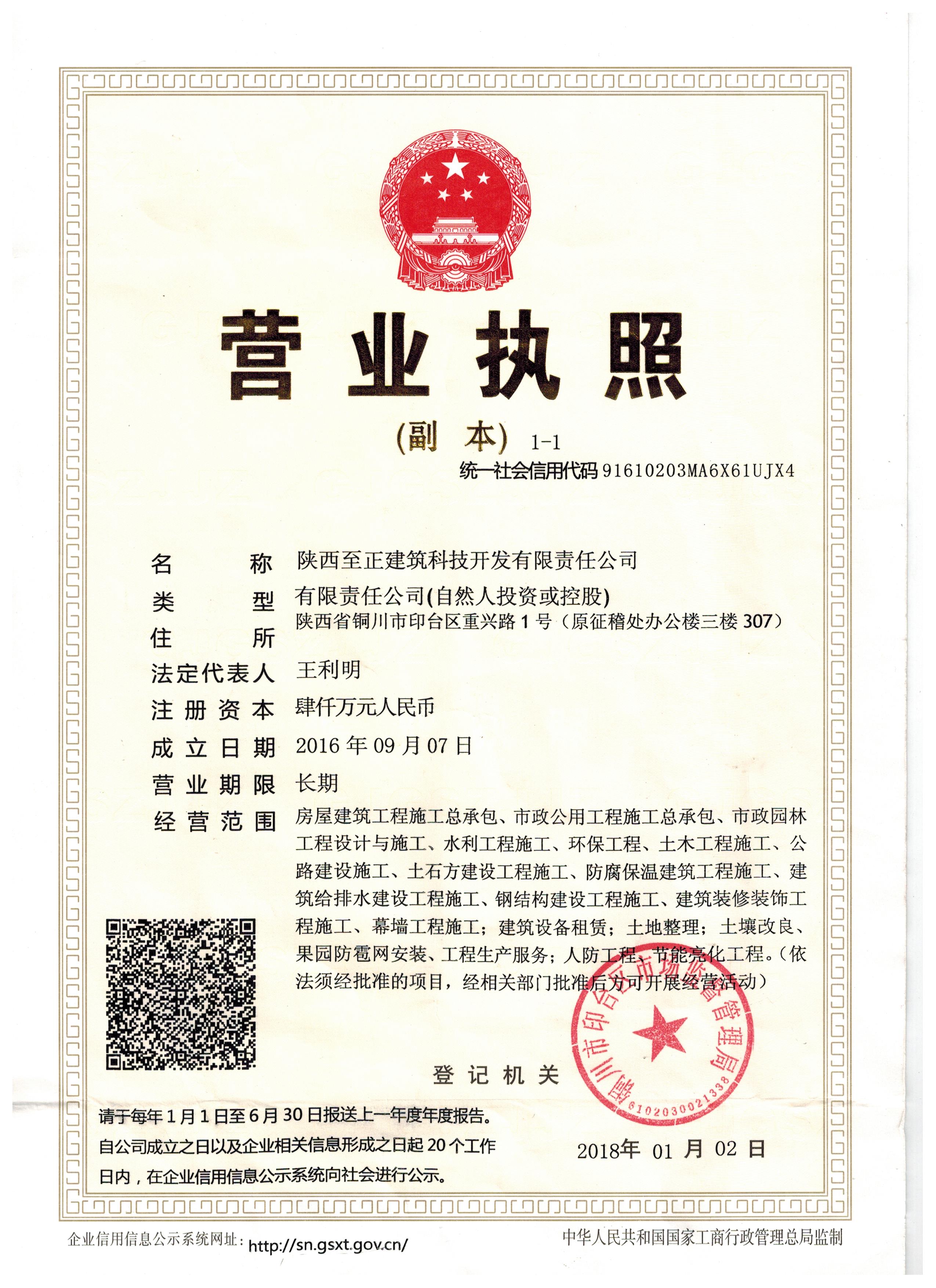 陕西至正建筑科技开发有限责任公司成立于2016年9月7日,是由自然人王利明、赵存勃、张彬出资4000万元组建的有限责任公司,经铜川市印台区市场监督管理局核准,取得了91610203MA6X61UJX4号企业法人营业执照。