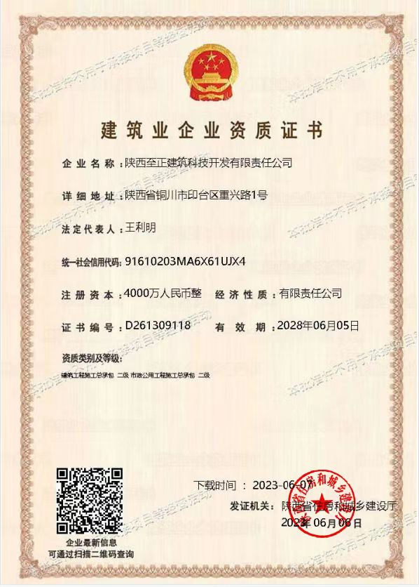 经铜川市印台区市场监督管理局核准,陕西至正建筑科技开发有限责任公司正式成立,取得了企业法人营业执照,注册资本4000万元。
